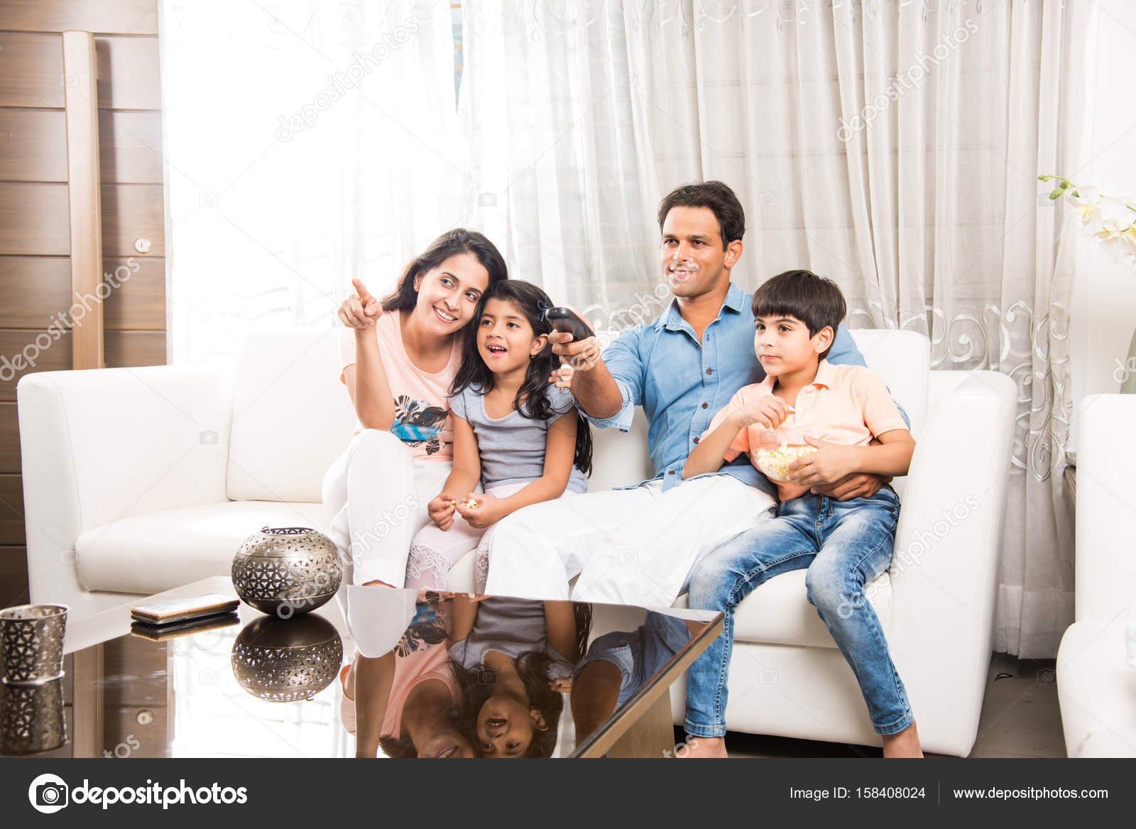 Indian Young Family Of 4 Sitting On Sofa While Watching Tv